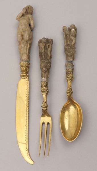 Editor: Here we have a fork made between 1745 and 1765 by the Meissen Manufactory. It's crafted from porcelain. It’s quite ornate for a utensil! I’m immediately struck by the material—porcelain seems like an odd choice for something that's meant to be used, doesn't it? How should we understand an object like this? Curator: Let's think about the context of production. Meissen porcelain was a highly sought-after luxury good in the 18th century. So, is this really about eating? Or is it about displaying wealth and status? Editor: I see your point. The labor involved must have been extensive. The porcelain needs to be molded, fired, then hand-painted... it's not like mass-produced silverware today. It speaks volumes about class. Curator: Exactly! Think about the social stratification inherent in the production and ownership of such an object. What kind of labor went into its creation? Who would have used it? How does it separate the consumer from the means of production? Editor: So it's a material object that also tells a social story. How porcelain becomes this status symbol through skilled labor and limited access. It’s interesting how something as simple as a fork reveals so much about 18th-century society. Curator: Precisely. By focusing on the materiality of the fork – the porcelain, the gold – and understanding the complex processes required to create it, we gain insight into the social relations and power structures of the time. This transforms the perception of this decorative art into one interwoven with production and privilege. Editor: That’s definitely shifted my perspective. I now appreciate it as a historical object rooted in production, consumption and society, rather than purely for aesthetic or practical purpose. Thank you.