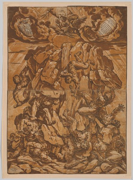 Editor: This is Alexandre Ubeleski’s "The Annunciation," created around 1690, using charcoal. I’m immediately struck by how the artist used a singular reddish-brown tone to create this scene with such dynamism and depth. What do you see in this piece from a formal perspective? Curator: The use of the red chalk, or sanguine, is paramount to the reading of the piece. Notice the delicate hatching technique Ubeleski uses to build form and volume. The linear quality, achieved through cross-hatching, directs the viewer's eye from the earthly realm to the divine. Note how the density of line work differs between the figures. What is achieved? Editor: The angel and the figures above appear ethereal. There's a lightness to them compared to Mary. The contrast separates the sacred and human spheres, creating a visual hierarchy. Curator: Precisely. Also observe the strategic placement of light and shadow. Ubeleski uses highlights to accentuate the folds of the drapery, thereby adding movement and emotional depth to each figure. Notice how the texture differs; this juxtaposition leads to the tension. Editor: Yes, the rough texture gives so much texture! This seems to animate each character's response to the scene. Looking closely, it seems Ubeleski didn’t prioritize detailed realism but wanted to evoke something grander? Curator: It emphasizes a visual language prioritizes emotion and movement. One begins to note the Baroque inclination to activate form; not simply to represent it, but create through its presentation something emotionally dynamic and transformative. Do you find the artwork successful at delivering on that aesthetic? Editor: Definitely. Paying closer attention to how the elements function formally reveals an interesting story. The lines and shading work together wonderfully. I'll need to revisit and analyze art this way from now on! Curator: Indeed, and what can be noted of the Baroque in one context has a relationship to our modern visual landscape in so many other complex ways. Consider how the structures create content and deliver experiences to a contemporary public.
