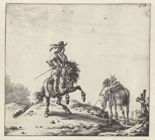 Stefano della Bella made this print of a soldier on horseback and one on foot sometime in the mid-17th century. It gives us insight into the realities of military life during the artist’s time. Della Bella was from Florence, and he traveled widely, documenting the social life and military conflicts of his era in meticulous detail. Here, the artist shows us the daily lives of soldiers, capturing the weariness and hardship of their profession. By focusing on the mundane aspects of the soldier's journey, Della Bella humanizes his subjects, inviting viewers to consider their experiences beyond the battlefield. To understand this image better, we can look at period military manuals, soldiers' letters, and other visual representations of military life. These sources help us to consider the social conditions that shaped artistic production and the public role of art.
