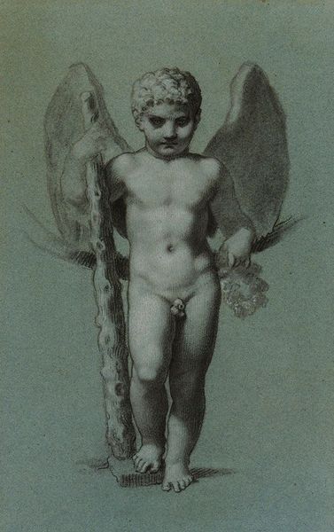 Curator: This is a drawing by Elihu Vedder, titled "Boy with Wings + Cornucopia." It features a nude winged boy standing before what appears to be a large, semi-circular cornucopia, all rendered in subtle tones. Editor: The immediate feeling is one of fragility. The light lines, the delicate shading… it’s almost as if the boy might float away. The wings certainly contribute to that. Curator: Vedder was deeply influenced by Renaissance art, wouldn’t you say? One can certainly observe echoes of Mannerism in the figure’s elongated proportions and subtle contrapposto. Editor: It certainly suggests classical ideals, yes, but I think the positioning of the figure is fascinating. Instead of fully emerging from the cornucopia, he stands slightly in front of it, almost disengaged, certainly removed from overt associations of abundance, especially considering it's essentially bisected from view. This seems like a commentary, perhaps? Curator: The cornucopia typically symbolizes abundance, as you said, and prosperity, so one wonders what its incomplete depiction conveys. The symbolism may have to do with Vedder's views on social matters or specific political events. Editor: Perhaps it suggests an idealized view of youth or the human form—a break with traditional depictions. It has the quality of longing. Note how Vedder employed delicate linear strokes of crayon or chalk and thin applications to establish tone. It's a subdued palette. Curator: Indeed. There's also the circle surrounding the boy, like a halo—or perhaps it denotes limitation, and containment, as well. It would be insightful to find more documentation pertaining to the artist’s symbolic intent here. Editor: True. It leaves the viewer contemplating the balance between aspiration and tangible reality. Ultimately, it’s a complex statement within the parameters of this understated rendering. Curator: Thank you. The play between aspiration and the incomplete resonates well. Editor: An evocative composition, indeed.