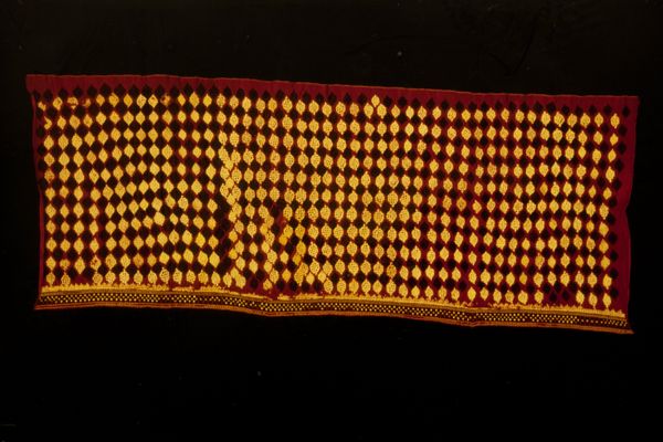 This style of belt was an important and expensive costume item that was often part of a bride's accessories which would be valued and used on special occasions during the rest of her life. This belt was worn folded in half (see wear marks at the center of the belt) and wrapped around the waist. By varying the wrapping, four different color effects could be achieved to coordinate with the garment being worn. Weaving technology used by urban Arab weavers was very sophisticated. A belt such as this, with its complicated and diverse patterning would probably have involved at least five specialists: a dyer to create the four warp colors, three coordinated weavers (one handling the weft thread and ground structure, and two developing the pattern), and a passementerie craftsperson to finish the braided warp ends.