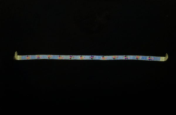 Editor: Here we have an artifact titled "Wedding Belt," likely crafted between the late 18th and early 19th centuries. It's made of silk, displaying intricate geometric patterns. I'm really drawn to the shifting colors and repeated motifs; they feel so precise. How do you interpret this work, thinking about its role in marriage and society? Curator: It's beautiful, isn't it? The act of weaving is powerful; think of Penelope weaving and unweaving a shroud in The Odyssey to hold off suitors, retaining control of her future. Textiles such as this 'Wedding Belt' weren’t just decorative; they were deeply embedded within social and cultural narratives. What stories might these patterns be trying to convey about marriage and the roles within that union during that era? How could something worn on the body push against, or cement, traditional practices? Editor: That's fascinating. I hadn't thought about it as a form of resistance or commentary. The idea that this seemingly simple belt could embody a silent language is compelling. Were particular colours and motifs commonly chosen, and if so, what meanings do they hold? Curator: Absolutely. Color symbolism would have been profoundly important. Beyond personal expression, it’s vital to see this piece in light of systems of power, gender dynamics, and the complex exchange of material goods during its time. Are there details or aspects within the structure and symmetry of it that strike you as unique, even disruptive? Editor: The shifts in colors disrupt the full symmetry between rows. That's thought-provoking. Seeing the textile this way makes me wonder about who made it, what was happening in their life, and the expectations being placed on marriage, versus how they really felt. Curator: Precisely! The artist, whose voice would be otherwise unheard by the historical establishment, might have purposefully coded it to be read that way! Consider, too, that such an intricate piece was a result of intensive, highly specialized labor. Garments like this speak volumes, even centuries later. Editor: Thank you, this gave me so much to consider about art and the people who created it. Curator: I'm equally grateful; this examination makes me keen to reconsider how these gorgeous and yet often overlooked pieces provide critical reflections on power dynamics through materials and designs.