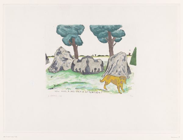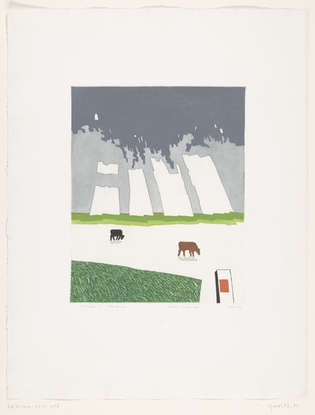 Editor: So, here we have "Vergeten landschap," or "Forgotten Landscape," a 1978 print on paper by Harrie A. Gerritz. The composition, with its geometric forms and earthy tones, evokes a sense of both nostalgia and perhaps a slightly unsettling stillness. What stands out to you when you look at this piece? Curator: Ah, Gerritz. What I see is a visual poem. Notice how he plays with memory. It is not quite reality, more of a half remembered place, like a dream slipping away. The geometric elements provide structure, almost like the remnants of a rigid, modern world, yet they’re softened by the natural landscape, creating this beautiful tension. Does it resonate with any place familiar, or even from memory? Editor: I hadn’t really thought of it that way, as a blurring of reality. Now that you mention it, it reminds me of driving through farmland as a child. So… are the minimalist lines suggesting maybe power lines or something? Curator: Possibly. I tend to think more about them representing forgotten connections. Look at how they float above the landscape, disconnected and apart. It’s almost as if he’s saying the modern world exists alongside the natural one, yet the two rarely meet, leading to the forgetting. That single cow reminds me of early cave painting too! Editor: Interesting. I like that idea, this intersection of the ancient and the modern leading to this sort of collective amnesia about nature itself. Curator: Yes! What do you think the artist felt? Did he celebrate that or mourn it? Editor: Hmm. I initially read this artwork as calming, even. But the longer we discuss, the more I realize I was drawn to that unsettling stillness, that slight tension you mentioned earlier. Curator: Well put. Art opens like a blooming flower when we have conversations like these, doesn’t it? There are just some things that we would never find on our own!