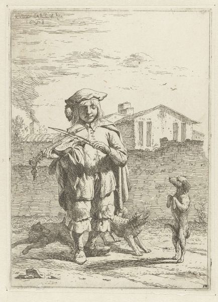 Curator: There's something deeply melancholic in this etching, wouldn't you agree? The figure looks almost lost. Editor: This is Karel Dujardin’s "Savoyard Boy with Dancing Dog," housed here at Harvard. It's fascinating to consider the social context surrounding itinerant entertainers in the 17th century. Curator: The image evokes a poignant sense of displacement. The boy’s downcast gaze, the slightly bewildered expression of the dancing dog – it speaks of a shared, precarious existence. The dog on its hind legs could also symbolize reliance, mirroring that of the boy. Editor: Indeed, these images romanticized, but also othered, marginalized communities. The print media of the time played a pivotal role in shaping public perception. Curator: The repetitive marks in the etching create a sense of muted dynamism that captures both the transience and the enduring human spirit. Editor: It certainly reveals much about the art market and the consuming public's appetite for certain narratives back then. Curator: A small artwork, but a grand history to behold. Editor: Precisely, a window into a world shaped by artistic trends and social dynamics.