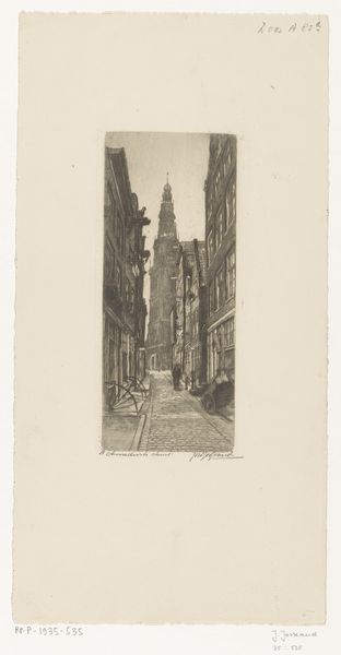 Curator: Here we have Frederick Landseer Maur Griggs' "Gezicht op Clifford's Inn," created in 1903. Editor: My goodness, there's a kind of haunted tranquility about it, isn’t there? All those carefully etched bricks, each with its story etched in soot and shadow. It’s as if time itself is layered into the very paper. Curator: Griggs was renowned for his masterful technique, deeply rooted in the etching tradition. What is captivating is the density of marks to create contrast. It shows the working and reworking. Editor: I keep coming back to that spire peeking out from the back. The perspective draws you into that deep space almost against your will. What story does the site hold, do you think? Curator: Clifford's Inn was historically associated with legal professions. Griggs created a connection between urban life and institutions via intaglio, transforming mundane subjects into artful depictions. Editor: Law offices—suddenly the aged paper feels appropriate. All those legal documents and ledgers slowly yellowing with age, echoing through time. A reminder of contracts, decisions, and stories embedded into that physical place. Curator: Indeed. Also note the texture. In some of his prints, Griggs used deliberately old, uneven plates which imbued an antique character to the finished prints. The social context here seems embedded within the art and manufacture itself. Editor: Yes. But also it invites a different pace. To slow down, to notice what lasts. In this era of fleeting images, it almost commands us to stop and reflect, doesn’t it? There's a permanence achieved in such fine lines. Curator: Griggs' approach brings us into contact with the urban landscape and makes us consider not just the imagery but the entire history of its making and remaking. Editor: I am now convinced those dark etched lines hold secrets! So much history, so much craft; now I’ll look at buildings differently forevermore.