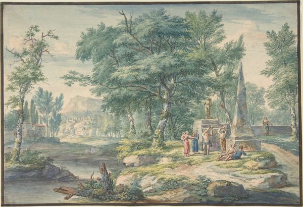 This Arcadian Landscape was rendered by Abraham Rademaker in pen, brush and watercolor. The landscape presents ruins inhabited by classical figures that reflect the enduring human desire for an idyllic past. Note the presence of the sphinx, a symbol originating from ancient Egypt and adopted by the Greeks, typically guarding temples and tombs. This mythological creature is seen in Renaissance art as an emblem of wisdom. Its enduring presence in art, from the ancient world to Rademaker’s time, reflects a collective memory of the desire to protect sacred knowledge and confront the unknown. The architecture, with its crumbling grandeur, evokes a melancholic sense of time's passage, tapping into our subconscious awareness of mortality. Consider how the image of the sphinx is constantly being rediscovered, reinterpreted and revived. This highlights the power of visual symbols to transcend time.