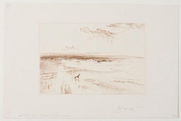 Editor: So, this is John Ruskin's "Dawn After the Wreck". The scene is somber, almost desolate. It's a beach with a lone dog. What social commentary do you see here? Curator: Well, considering Ruskin's deep engagement with social issues, this work speaks to the human cost of progress. The wreck symbolizes societal collapse, perhaps due to industrialization. The lone dog, a survivor, suggests resilience but also profound loss. Editor: Loss of what, specifically? Curator: Perhaps a loss of traditional ways of life, the destruction of nature in the pursuit of profit, and the isolation of individuals within a rapidly changing world. Ruskin often critiqued these consequences of Victorian society. Does that resonate with you? Editor: It does. Seeing the wreck as a symbol of broader societal issues makes the image much more potent. Curator: Exactly. It's a reflection on the relationship between humanity, nature, and the structures we build.