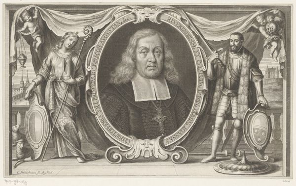 Georg Daniel Heumann etched this portrait of Johann Georg Pritius, embedding it with symbols that echo through centuries. Pritius, framed in an oval, is flanked by allegorical figures. To the left, a woman holds a cross and a candle, emblems of faith and enlightenment that can be traced back to early Christian iconography, guiding believers through darkness. On the right, another figure leans on a large set square, a tool associated with reason and order. These figures draw upon the ancient tradition of personifying abstract concepts, reminiscent of classical sculptures of virtues and vices. The cross, a symbol of sacrifice, reappears across time, from ancient Roman vexillums to modern-day emblems of hope, continually transformed by cultural and psychological forces. The convergence of these symbols evokes a deep-seated tension between faith and reason, a cultural dialogue as old as humanity itself. This potent combination deeply engages our subconscious, reminding us of the eternal quest for meaning. These motifs continue to evolve, resurfacing in unexpected forms, perpetually renewing their significance.