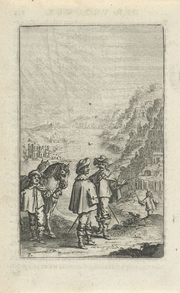 Editor: We're looking at "Telemachus in gesprek met Mentor," an engraving created around 1715 by Jacob Folkema, currently held at the Rijksmuseum. The scene feels almost staged, a bit like a play. I wonder what exactly is going on here; how do you interpret this work? Curator: Ah, a frozen moment in a grand story. This isn't just figures posed stiffly, but a dance of power, guidance, and destiny. Note the landscape: a stage for legendary deeds! Do you feel the tension simmering beneath the surface, the weighty decisions that hang in the balance for Telemachus? Editor: Now that you mention the landscape as a stage, the background feels intentionally crafted. Are Mentor's gestures symbolic? Curator: Absolutely. Mentor's gestures speak volumes. See how he offers a sprig of, perhaps, olive? A sign of peace, a path of wisdom. Jacob Folkema gives us more than an illustration, more like a moment of reflection on what a hero *ought* to value. Who stands beside and *behind* the hero also reveals part of the intent. What does that mean to you? Editor: I never considered it like that. So it's not just about illustrating the story, it's about making a point? The artist trying to teach us what a hero should represent. Curator: Precisely! And maybe also commenting on leadership of the time. Always question the artist's intentions, but embrace what it makes *you* feel in the moment! Editor: I will from now on. That makes a lot more sense now.