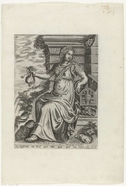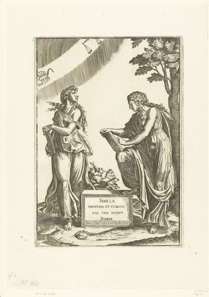 Curator: Ah, what a wonderfully pensive image! It's an engraving from 1575 by Philips Galle, called "Tiburtijnse Sibille", residing here at the Rijksmuseum. It has this sort of… wisened stillness to it. Like a quiet storm of prophecy contained. Editor: Yes, and immediately I'm struck by the way the Sibyl is positioned. Perched on a craggy outcropping, flanked by these almost menacing trees, it's a landscape pregnant with a kind of...precarity. The classical contrapposto of her pose juxtaposed with the wild, almost gothic sensibility of the forest around her... interesting. Curator: Gothic, you say? Well, maybe it’s my own slightly-askew perception, but I see that classical influence as totally taking hold, particularly in the drape of her garments and the way her form fills up all the space— like it's wrestling against the confines of the frame itself! Editor: Agreed, the classical influence is undeniable, especially when viewed through the lens of Renaissance Humanism, of course. I keep thinking about the prophecies attributed to the Sibyls. Remember, these prophecies, delivered by women outside the patriarchal structures of the church, often acted as subversive commentaries on power. Consider also the complexities of representing female authority in the 16th century and beyond, how Galle situates her— Curator: Indeed, you speak to this so poignantly; but perhaps it can be equally taken as that universal feeling to know or suspect, that this kind of knowledge brings both power and immense pain. The heaviness, but then, lightness. Do you catch that too, maybe? Like she holds up, somehow… Editor: Precisely that tension—between the burdens and the blessings, so to speak—captures something really compelling in these early modern interpretations of ancient figures. She embodies paradox! But how that paradox is read, received... it is perpetually subject to reinterpretation. Curator: How right you are! This kind of dance, I suppose. Anyway, I could happily stare at this piece all afternoon, and not tire of that expression she holds so well. Editor: And maybe that, in essence, is why we keep turning to these old, mysterious images—because their depths allow for so many reflected glances, again and again.