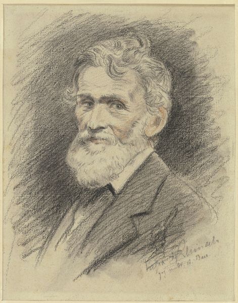 Curator: Ah, there he is! I think you'll agree, Otto Scholderer’s “Portrait of Dr. George Bird,” crafted around 1877, has quite a presence. It's rendered primarily in charcoal and pencil, but also shows the touch of graphite and chalk, giving it this wonderfully subtle tonal range. Editor: What immediately strikes me is how the unfinished quality—you can even see the grid lines underneath—adds a vulnerability. It's like we're catching him in a moment of becoming, you know? As if the essence of Dr. Bird is emerging before our eyes. Curator: Absolutely. The preparatory marks remind us that it’s a constructed image, a distillation of observation, and technique. A deliberate realism, bordering on the academic, one might say. But the softness of the rendering… Editor: Yes, softens the academic feel for sure. I'm drawn to his eyes, there's such humanity there. That beard… it is almost biblical. Beards in art often signify wisdom, maturity, even a sort of patriarchal authority. Is he about to impart ancient truths? Or just tell me about his aches and pains? Curator: (Laughing) A little bit of both, perhaps! Considering he’s a doctor, maybe it’s aches and pains first! But yes, his steady gaze is compelling. Think about the symbolic weight of physicians in the late 19th century, with the advancements in medicine and germ theory. He becomes an almost shamanistic figure. Editor: That’s it exactly! He has access to hidden knowledge, scientific secrets... knowledge that feels, in that time, akin to magic. And notice the details in the face are more precise than the gestural depiction of his jacket and body. It subtly pulls the eye to the portrait's focal point and anchors him into the field. Curator: Precisely. The unfinished nature of the torso focuses the weight of the composition upward. And technically speaking, the drawing, through shadow and highlights, displays the intellectual process of observation by Scholderer of the good doctor. Editor: This portrait embodies the moment, right before photography completely dominates portraiture. Artists trying to hold onto something they’re inevitably about to lose. Curator: A struggle to capture essence before it’s mechanized. Beautifully put! Well, this encounter certainly made me reflect anew on the complex tension between realism and something much deeper… Editor: Me too. Looking at it more closely now, I sense something hopeful, almost expectant. Maybe it's us, as viewers, who bring that expectation. Food for thought indeed!