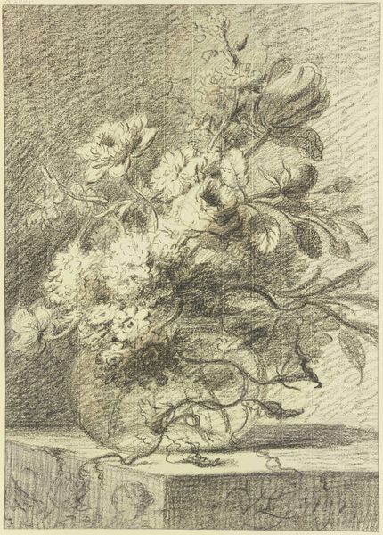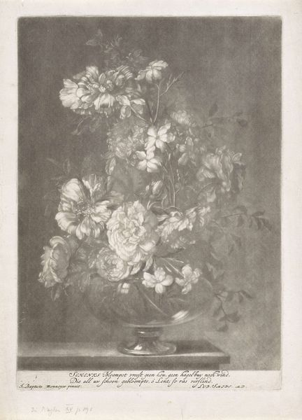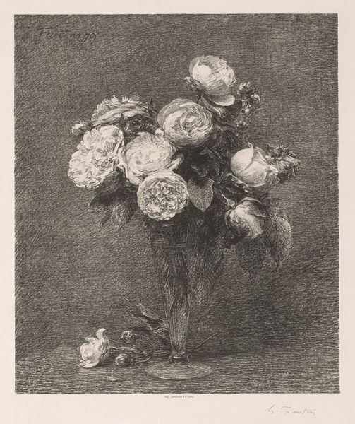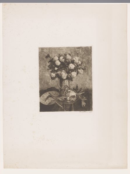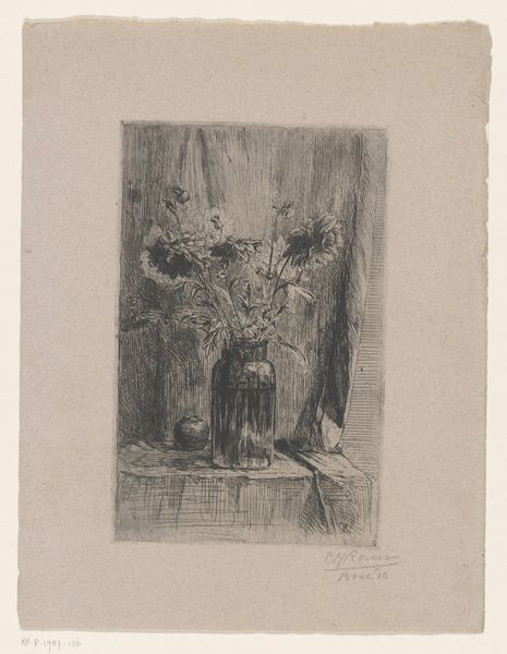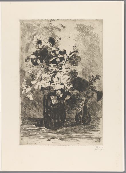 Editor: Barbara Elisabeth van Houten's print, "Petunia's in een glazen vaas," probably made sometime between 1877 and 1950, really captures the texture of those velvety flowers, even though it's just an etching. There's something so delicate yet intense about it. What stands out to you the most in this piece? Curator: It’s that contrast, isn’t it? The way she coaxes out that velvety bloom, then plunges it into near darkness. I find it mesmerizing. Think about it – an etching relies on the precision of the line, but here, it feels almost painterly. Are we looking at the fullness of life, a delicate bloom in full glory, or are we sensing, perhaps, a meditation on mortality, that the bloom is temporary, cut off from the source and in glass vase? Editor: That's a darker interpretation than I had initially, but it resonates with me. I guess I was so focused on the skill involved. The petals do seem almost to spill out, refusing to be contained. Curator: Precisely. Consider what it meant to depict domesticity back then, versus how she portrays this untamed petunia. A little rebellious, wouldn't you say? Look how it sprawls and encroaches beyond that neat, conventional vase! I imagine she did this piece and maybe giggled a bit about it? Editor: I didn't catch that tension initially, but it is evident. That is exciting, it feels so forward-thinking for its time. Thank you! Curator: My pleasure! And now, you've given me fresh eyes to appreciate the rebellious spirit.