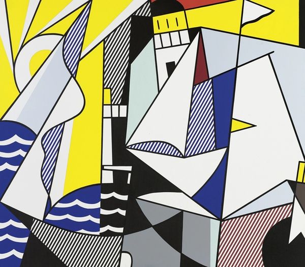 Curator: Oh, my, this piece feels incredibly… assertive. The sharp angles and bold, flat colors hit you immediately. Editor: Indeed. What you’re seeing is Roy Lichtenstein’s “Perfect Painting #1,” created in 1985 using acrylic paint. Lichtenstein, of course, is deeply embedded in the Pop Art movement. Curator: Right, that becomes immediately apparent, it's unmistakable! But what exactly is Lichtenstein trying to communicate? The term "perfect painting" reads as supremely ironic considering the seeming visual chaos. Editor: That's precisely what makes Lichtenstein so compelling. He challenges our preconceived notions of "high" art. We have to consider how, by appropriating the aesthetics of commercial printing—the Ben-Day dots, the flat colors—he disrupts the art world establishment. How it democratized imagery. It suggests the role that media representation had in our lives in the 80s, but perhaps it feels more relevant today. Curator: Absolutely, especially through a lens of race and class! The fact that these aesthetics are derived from mass media, historically controlled by powerful interests. It becomes more a subversive act that allows working-class iconography into privileged gallery spaces. But still… it is incredibly visually busy; is the lack of clear subject a rejection of traditional art narratives? Editor: I believe so. Lichtenstein engages with abstract art’s legacy, specifically geometric abstraction, which had very definite cultural implications through its use as interior decor for white bourgeois spaces. This is like, meta abstraction—abstracted abstraction! What does it mean to claim the space? Curator: Interesting. The boldness could also be interpreted as an act of defiance against art historical conventions… appropriating the high modernist styles of suprematism. Lichtenstein seemed like he was actively reinterpreting and even satirizing male-dominated movements through a Pop Art filter. Editor: Precisely. It becomes clear through his engagement that Pop Art served a powerful critique of these artistic legacies. This reinterpretation opens a space for conversations on art, culture, and society. I think a key piece here, perhaps the defining piece, is not merely the work's immediate impact, but the ripples of conversation and discourse it creates. Curator: Very true, viewing “Perfect Painting #1” has certainly nudged me to re-examine the familiar framework, in the sense of our culture in this case, art for the people, or against the people. Editor: Exactly, I agree. Its placement into society changed things. Lichtenstein makes you confront uncomfortable yet relevant aspects.