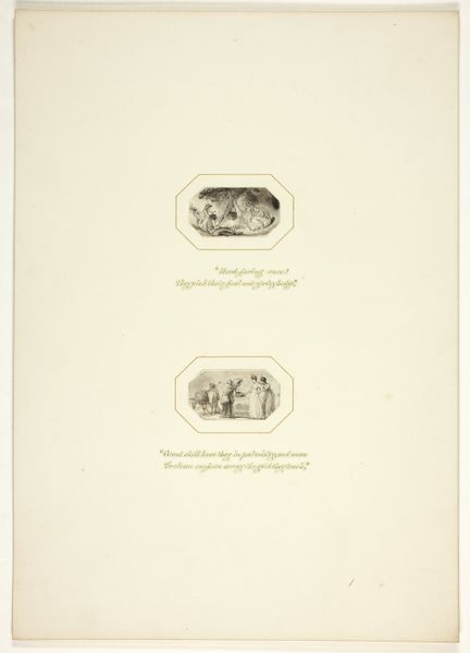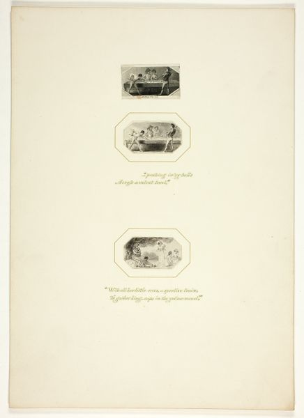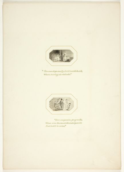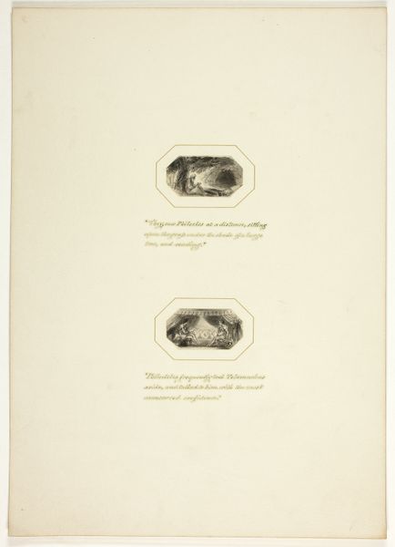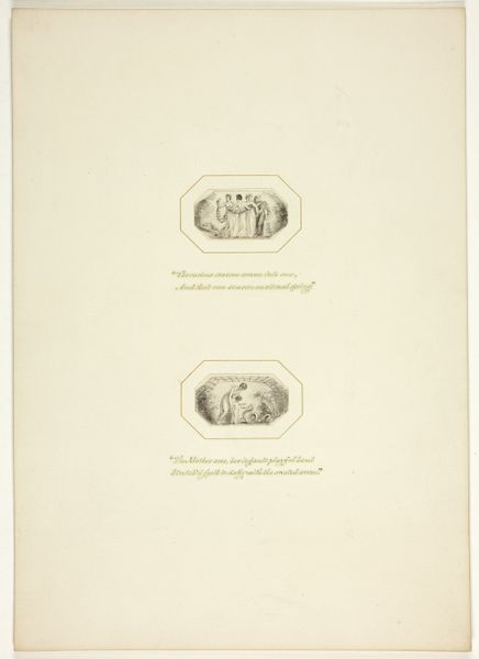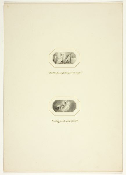 Editor: Here we have "Plate from Telemachus," created around 1797 by Thomas Stothard. It combines drawing, etching, and engraving on paper. The organization of the panels within the frame is striking—almost like a storyboard. How would you interpret Stothard’s design choices here? Curator: Focusing on its form, note the tight linework and delicate gradations of tone, typical of academic art of the period. Observe how the composition within each vignette uses light and shadow to create dramatic focus. Stothard is clearly drawing on neoclassicist principles, evidenced by its rational order. It is a line etching with engraving – are you aware of what effects the etching might produce here? Editor: I see. So the etching perhaps provides the broad outlines, and the engraving allows for finer details, adding to the dramatic effect you mentioned. But the style seems unusually restrained, even for academic art, right? Curator: Restraint, perhaps, or refinement. Consider the geometric shape of each panel and how the text anchors them to the page. These stylistic decisions contribute to a balanced visual rhythm. How do you think it relates to Neoclassical philosophy? Editor: I guess the balance reflects the era's focus on reason and order, distancing itself from the excesses of earlier styles. Curator: Precisely. Through Stothard’s controlled use of line and carefully arranged compositions, a deeper understanding of Enlightenment aesthetics emerges, but even in these vignettes there are narrative nuances created by how the picture planes are organised, do you see it? Editor: That’s interesting, I hadn't considered it that way before. It really is amazing to see how form and content come together in such a cohesive manner. Curator: Indeed; by considering line, shape, and structure we can find much in a work of art.