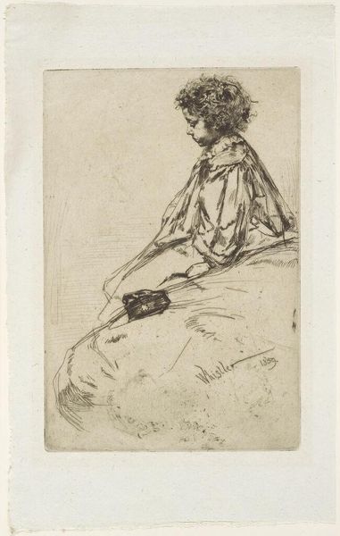 Editor: Here we have James McNeill Whistler's etching "Bibi Lalouette," created in 1859. It’s delicate, almost like a fleeting memory captured in ink. What strikes me most is its melancholic mood. What do you see in this piece, Professor? Curator: Melancholic, yes, but perhaps also contemplative. This isn't just a portrait, it's a whisper of a feeling. The soft, flowing lines remind me of those hazy childhood summers, everything draped in a kind of golden light. Notice how Whistler uses the etching needle, it’s almost scribbling to create depth and shadow. Almost impressionistic, decades before the movement truly bloomed. Editor: So you're saying the medium itself contributes to that ephemeral quality? It almost feels unfinished in places. Curator: Precisely! Whistler plays with suggestion, hinting at form rather than defining it. This invites us, doesn't it, to fill in the blanks, to project our own memories onto Bibi. Does her posture suggest sadness, or simply quiet observation? Editor: I hadn’t thought of it that way. It makes the piece feel more personal, somehow, less like a formal portrait and more like a shared secret. Curator: Art at its finest! The conversation between artist, subject, and viewer creates an emotional connection and provokes feeling and thought! Editor: This has made me look at etchings in a whole new light, like tiny poems rather than just copies of reality. Curator: Wonderful! And, isn’t it marvellous when a work of art unveils an emotional understanding within us.