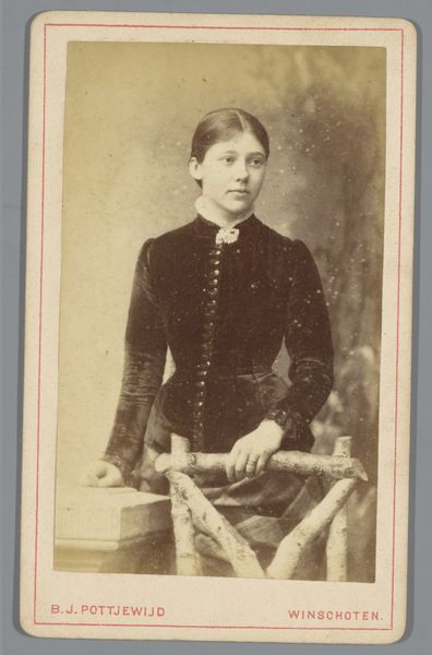Editor: We're looking at "Portrait of an Unknown Man," a gelatin silver print photograph from 1887 by Albert Greiner. The figure looks melancholic. What story do you think this portrait whispers? Curator: Oh, I love that framing, whispering is exactly right! The sepia tones, the way the light catches the subject’s face…it all speaks of a bygone era. Think about the sheer novelty of photography then. Each shot was a precious, carefully considered event. This man, whomever he was, consciously chose to be immortalized. What secrets do you think he carried in his buttoned-up frock coat? I feel a certain restraint; almost as if a world of emotion is held back, which, being realistic, fits perfectly the late 19th century cultural moment. Editor: Restraint is a good word. Do you think that posture, leaning against what looks like a fence, adds to that impression? Curator: Absolutely! It’s not a grand, assertive pose. There’s an intimacy, almost vulnerability, in the gesture. Makes me think about all those forgotten faces in our old photo albums. Fleeting glimpses into lives lived, frozen in time. He looks so stern. What could possibly bring joy into his life? Did he have a lover? What were his dreams? Editor: So it becomes, not just a portrait of a man, but a portrait of a moment. Curator: Precisely! The limitations and opportunities of early photography created this beautiful intersection between art, technology, and the human desire for remembrance.