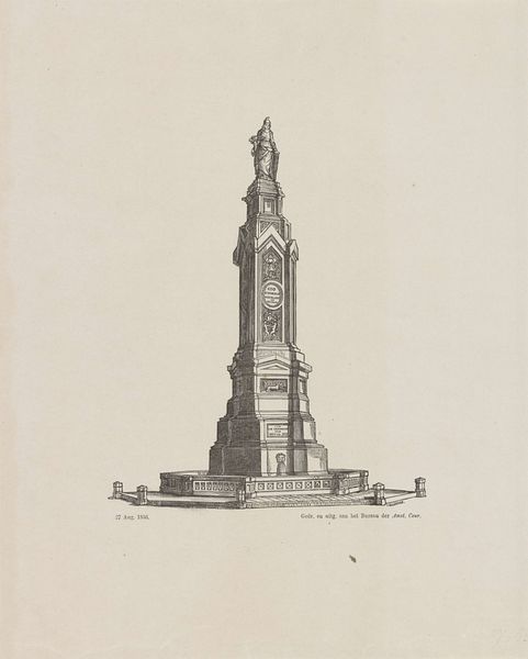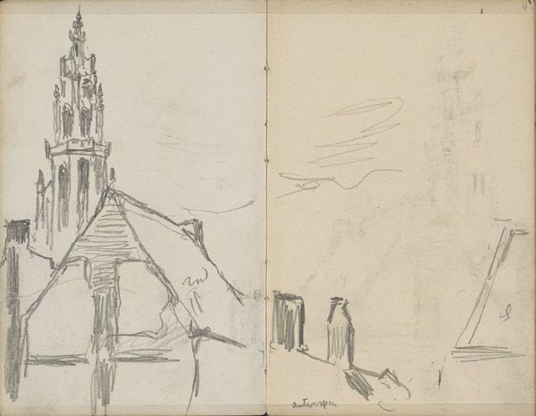 Editor: This is Cornelis Vreedenburgh’s "Kerktoren," or "Church Tower," made sometime between 1890 and 1946, rendered in pencil. It's interesting how minimal the composition is; it gives a very serene, almost haunting, feeling. How do you interpret this work, especially given the time period it was created in? Curator: Well, considering the period, this "Kerktoren" takes on layers of significance. This wasn’t just a church tower, but a landmark potentially representing community, faith, and resilience during times of immense social and political upheaval. How do you see its minimalist aesthetic reflecting these historical realities? Editor: That's a compelling point. The sparseness could reflect the instability or fragility of that era. Perhaps Vreedenburgh was questioning the permanence and authority of religious institutions. The lack of detail could also indicate a sense of detachment or alienation, which aligns with a lot of existential philosophy. Curator: Precisely. And if we think about how this drawing, seemingly simple, invites such a depth of reflection – what does that say about the artist's intent, and the viewer's role in completing the narrative? How can a minimalist sketch like this become a powerful commentary? Editor: It prompts us to consider what's absent as much as what's present, and to really consider the multiple contexts this single spire existed in. The pencil medium adds another layer of meaning, highlighting both a historical simplicity but also emphasizing accessibility. Curator: Exactly! Art like this reminds us to constantly question not only the aesthetic, but the social, political, and cultural forces shaping artistic expression, especially in periods of unrest. Editor: This has been a profound exploration of Vreedenburgh's "Kerktoren;" looking at it through a contextual lens gives it much more weight. Curator: Indeed. It demonstrates that art, regardless of its simplicity, can spark essential dialogues about society, identity, and historical consciousness.