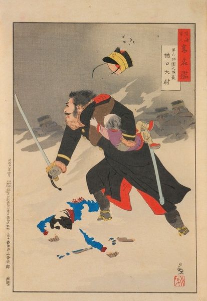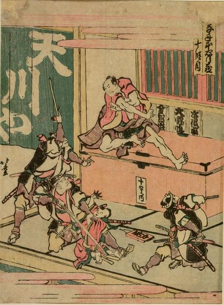 Curator: This woodblock print, titled "Shin Yoshiwara Magic Scene," was created by Utagawa Yoshitsuya. What are your initial thoughts on its composition? Editor: The scene feels dynamic, chaotic even. The diagonal lines of the swords and spears create a sense of urgency, pulling the eye in different directions. Curator: Indeed. Yoshitsuya, who lived from 1822 to 1866, was deeply involved in depicting the social realities of his time. Consider the materiality of the print itself. Woodblock printing was a labor-intensive process. Editor: Absolutely. The distinct lines and blocks of color—the blues and greens especially—are so striking and contribute to the overall visual impact. It's a powerful arrangement of shape and form. Curator: The process would have involved skilled artisans, each playing a crucial role in the production and distribution of this print. Editor: It's fascinating how Yoshitsuya captured such vibrant movement. It's a testament to his skills and the quality of the materials. Curator: Reflecting on this print, I'm reminded of the intricate network of labor and skill embedded within each impression. Editor: I'm struck by how such a flat, patterned surface can evoke such a strong sense of dramatic action.