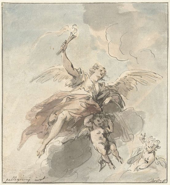 Editor: This is Gaspare Diziani’s "The Fall of Phaeton," created between 1745 and 1750 using pen, ink, and wash. The dynamism really strikes me. The figures seem caught mid-motion in a chaotic descent. What do you see in the composition of this work? Curator: The energy is palpable, isn't it? Diziani masterfully employs diagonal lines to enhance the feeling of collapse. Observe how Phaeton and his chariot, along with the panicked horses, dominate the upper left quadrant, pulling our gaze downwards. Note also how the foreshortening amplifies the depth of the picture plane. Editor: So the formal arrangement mirrors the narrative of the fall? It’s interesting how the use of line seems almost scribbled and rapid. Is that typical of Diziani's drawings? Curator: Precisely. It is a common trait in his work. The lines delineate form but also generate movement and texture. The artist doesn't pursue photographic accuracy; instead, line and shadow create dramatic emotional impact. Editor: The tonal range seems limited. How does that choice impact the work? Curator: Restricting the palette focuses attention on the interplay between light and shadow, enhancing the drama. It underscores the inherent tension within the scene itself. Consider, for instance, the figures in the lower right. The careful arrangement creates emotional response in us as we witness Phaeton's tragedy unfold before us, a grand narrative in a limited chromatic spectrum. Editor: I see. The limited palette isn’t a limitation, but rather a powerful choice to heighten the emotional intensity. Thanks! Curator: Indeed. And thinking about the artwork using purely formal analysis enriches our understanding of its subject.