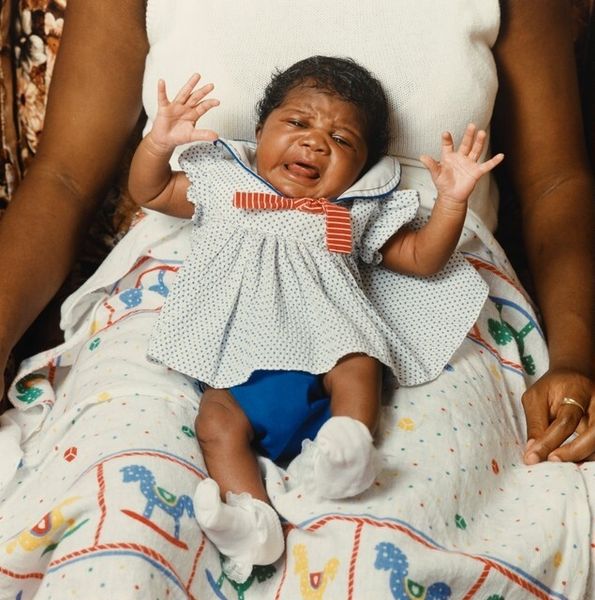 Editor: This is Debora Hunter's photograph, "6 Days Old," potentially taken between 1989 and 1998. It's a realistic portrait, deeply personal. There's something so intimate about the soft focus on the infant being held. What do you see in this piece, particularly in how it’s been produced? Curator: Well, the very act of photographing and then presenting such an image is a conscious commentary on labour—specifically, reproductive labor. Consider the maternal clothing—perhaps mass-produced, certainly practical, suggesting function over embellishment. The photographic process itself captures a moment plucked from an ongoing cycle of physical and emotional investment. The baby’s clothes also seem to signal social position, don’t they? Editor: They do. But, how much does the probable availability of cameras at the time impact the piece’s message, compared to, say, a painting of a mother and child? Curator: Precisely! The *means* of production shapes the artwork's impact. Painting is an art practice generally restricted by time and skill; anyone can produce a photograph if they have the access and the disposable income. That’s the real genius here. Its message and effect comes from its production. Editor: I hadn’t considered the everyday aspect of photography here as something with value, but it really reframes it. Curator: It disrupts our tendency to separate craft, like caretaking, from 'high' art. Hunter's lens directs us to value those daily gestures. Editor: Absolutely. Seeing it as more than a sweet picture, but as an act of recording lived, material experiences… Curator: Exactly, revealing how photography plays its part in those realities. We both came away with new eyes now!