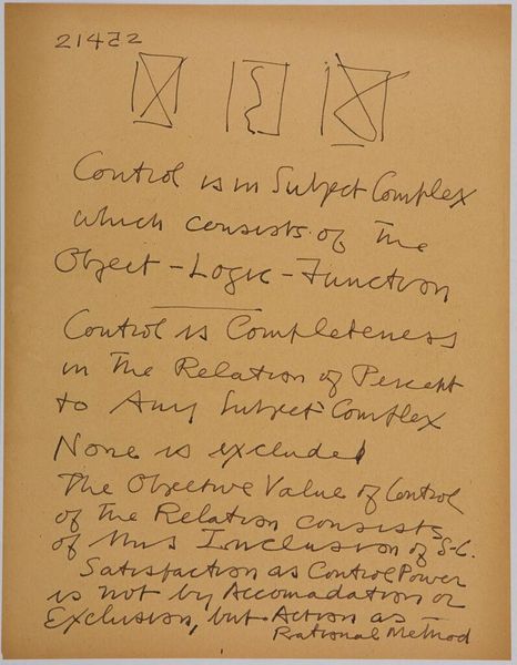Curator: This is "Art Theory Text with Stars and Diagrams" by Stuart Davis, undated, but likely from around 1943 based on the inscription. It's currently held at the Harvard Art Museums. Editor: My first impression is…diagrammatic! Almost like a chaotic mind map, but with a very specific, almost scientific visual language. It feels like he's trying to pin down something elusive about art itself. Curator: Precisely. Davis was deeply interested in the theoretical underpinnings of abstraction. You see these recurring star motifs and geometric shapes. They are less illustrative and more symbolic, hinting at a deeper structure. Editor: The handwritten text gives it such a personal feel, though. He's wrestling with ideas of "emotional content" and "color-space" – it's like peeking into his artistic process, this messy, beautiful attempt to intellectualize creativity. It’s a vibe. Curator: Indeed, his use of these geometric forms might represent the underlying abstract structures he believed dictated emotional response to a work. Editor: Ultimately, seeing this really helps humanize what can feel like impenetrable theories and make it feel alive. Curator: A fitting end to our conversation.