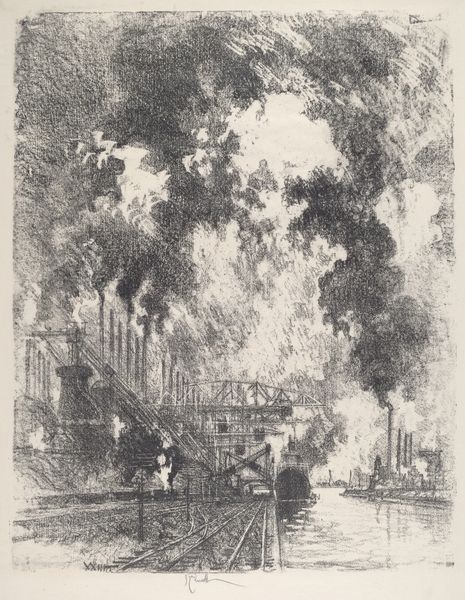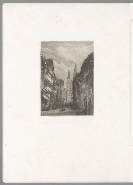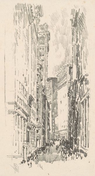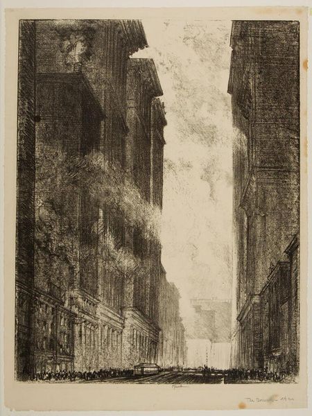 Curator: Joseph Pennell's etching, "Fourth Avenue," created around 1910, provides us with a glimpse into early 20th-century New York. Editor: It strikes me immediately as claustrophobic yet somehow uplifting. The buildings are looming presences, but the light spilling down the avenue draws your eye upward. Curator: Absolutely, that light! Pennell, an American expatriate, often depicted burgeoning metropolises. But it's essential to contextualize this era. Cities like New York were undergoing rapid industrialization and grappling with the resultant social inequalities. The etching, in its gritty realism, subtly hints at that tension. Consider also that, at the time, cities embodied a sense of possibility for immigrants and others marginalized at the periphery, many traveling there from rural contexts for opportunities. Editor: I see your point. There’s certainly a tension between aspiration and reality. The grand architecture implies progress, but the masses of tiny figures at street level feel…anonymous. This prompts questions of urbanization’s impacts on community and individual identity, topics that directly reflect conversations happening about class and race. Who were these anonymous people and what was their lived experience? The visual hierarchy seems to flatten those lives into cogs of the city's grand machinery. Curator: Indeed. And look at his technique! The intricate lines create texture, but also almost a sense of transience, perhaps alluding to the city's constant state of flux, particularly considering the city's early modernist social, artistic and aesthetic revolutions occurring at that time. Editor: True. One has to also consider how images of progress and modernization impacted global culture. Urban spaces often carried colonial associations. Curator: Very astute. Thank you for those considerations! It's pieces like this one which remind us of the enduring social and artistic value of urban landscapes and the power of considering their many influences and layered histories. Editor: Agreed! This etching definitely sparked some new reflections regarding city imagery and those less heard and recognized who occupy its physical space.