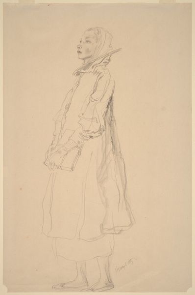 Editor: So this is John Singer Sargent's "Standing Figure with a Spear," a pencil drawing. It feels like a preliminary sketch, very immediate and raw. What jumps out at you about the materials and process used to create this? Curator: Immediately, I consider the societal implications of choosing a relatively "cheap" material such as pencil. It democratizes art-making, moving away from the exclusive domain of oil paints and bronze sculpture that were reliant on wealthy patronage and guilds. Pencil sketches often represent the initial stages of planning – studies meant for larger projects. How might we interpret the socio-economic reasons and intended purpose for the creation of this particular study? Editor: That’s interesting. I hadn’t thought about pencil as a choice loaded with meaning like that. What would be the labor or artistic skills required for this specific type of work? Curator: Well, consider the draftsmanship required to quickly capture the figure’s stance, and the subtle shading achieved through varied pencil pressure. Sargent’s facility allowed for rapid execution. It makes you consider not just the artwork itself, but also Sargent's role within the larger artistic economy. Were these sketches meant for public consumption or primarily for his personal study? Were assistants involved, or was this all his own hand? These questions point to the nature of artistic labor and production. Editor: I see what you mean. Viewing it as part of a larger system of artistic production really changes how I perceive it. I tend to view it just for how it looks. Curator: Exactly! Understanding the material and social context unveils the complexities of art, far beyond aesthetics alone. What did you make of the artistic license and skill evident? Editor: I guess what I now see that wasn't clear before is a shift in focus from appreciating the final 'product' to valuing its role in something bigger like production and labor.