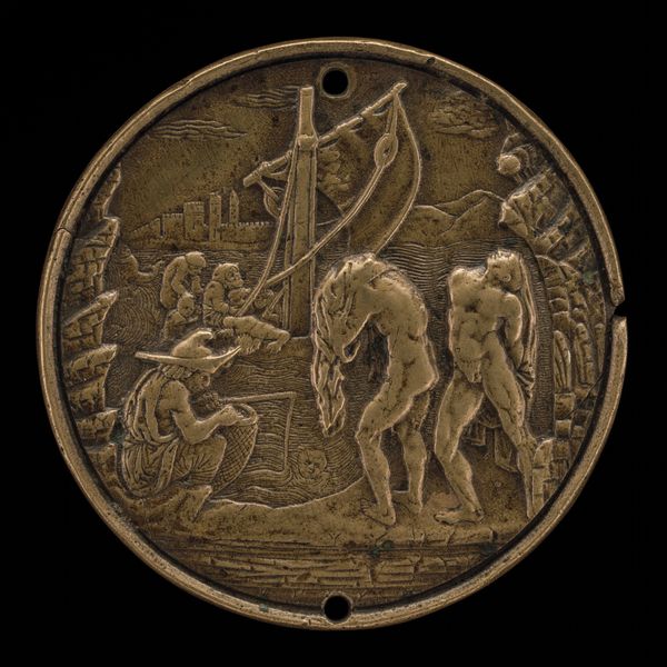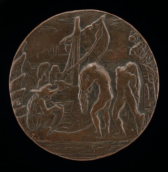 Editor: This bronze medal, "Lion Being Taught by Cupid to Sing," made in 1444 by Pisanello, presents an intriguing scene. I’m struck by the juxtaposition of the powerful lion with the delicate Cupid. What’s your take on this piece? Curator: Oh, it whispers tales, doesn't it? A Renaissance riddle in bronze! It's less about the literal, more about allegory. I see a wild, untamed force—the lion, maybe raw power, unrefined talent—being coaxed, taught the sweet song of civilization by Cupid, the god of love, poetry and refinement. The music scroll and tuning device point to this. Doesn't it feel like a dance between nature and culture? A little humorous even? Editor: Yes, definitely a funny image! But why a lion specifically? And the setting seems rather stark. Curator: The lion, of course, embodies strength, but also pride, the ego. That barren landscape underscores the challenges involved in refining raw potential. Everything essential and nothing superfluous! It’s a testament to Pisanello's sharp wit and the Renaissance love for classical symbolism – often encoded in enigmatic and erudite imagery that served a patron's personal or political purposes. Does the overall effect resonate with you in any way? Editor: It makes me think about the creative process itself. Like, taming your own inner beast to create something beautiful, but with humour, of course. I hadn't considered all those symbolic layers. Curator: Exactly! Art isn't always what you *see,* but what you *feel* and *imagine*. And I think Pisanello succeeded. Always question, always imagine, and never stop being surprised by what a piece of art can ignite within you!
