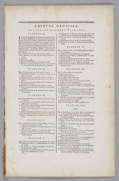 Editor: This print, titled "Plate Descriptions for 'Minting, Plotting and Molding Tools'" by Robert Bénard, seems like a technical document, perhaps an index? It's dense with text and reminds me of old encyclopedias. What do you see here, beyond the surface? Curator: I see a fascinating glimpse into the cultural memory of craft and industry. Each labelled element carries a story, a specific function within the larger narrative of minting. Notice how the text itself becomes a visual symbol, almost a map of the process. Editor: So, it's not just a list, but a representation of cultural knowledge? Curator: Precisely. The arrangement, the font, the very act of documenting these tools speaks to the value placed on this knowledge. It transmits the know-how of the era. What do you make of that, in our digital age? Editor: It's amazing to see this analog preservation. Now I see the print as a time capsule, revealing the mindset of a pre-digital era. Thank you!