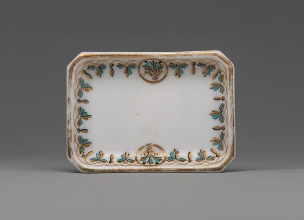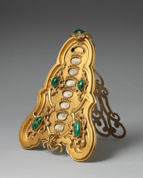 Editor: Here we have an 1851 bronze pen tray, designed by Asprey. Its delicate, flowing lines and accents of green malachite give it a certain… opulence. What jumps out at you about it? Curator: Immediately, the bilateral symmetry captivates. Each half mirrors the other, divided by that striking central malachite element. Observe the relationship between the bronze and the inlaid stones. Editor: They do create a beautiful contrast in color and texture. But is it just about visual harmony? Curator: Note how the swirling, organic bronze forms are carefully juxtaposed with the geometrical exactness of the stone inlays. This dynamic, present throughout, points to a fascination with structure and the relationship between the material properties, how would you relate this to Arts and Crafts ideals? Editor: I see your point. The craftsmanship is so deliberate, focusing on both function and form, and elevating what would normally be considered a mundane object. But is there a kind of symbolism there? Curator: Let us delve deeper into that suggestion. We see a dialogue between hard lines and curvilinear elements, how might one interpret these dichotomies within the structure of the object itself, considering its formal qualities, not necessarily any presumed intentions or historical narrative. What could that say? Editor: So, maybe it's about finding balance? The balance between industrial and artisanal aesthetics? Curator: Precisely. The eye is drawn to each individual detail: the malachite contrasting with bronze work. Editor: It’s like each component elevates the other. Thinking about the semiotic relationship, I am beginning to notice how different components come together to form a narrative within this piece. Thanks, I’m definitely looking at it with fresh eyes now! Curator: A pleasure, you too have provided great observation skills that complement my perspective.