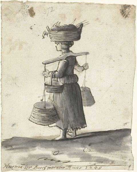 This drawing, ‘Eierverkoopster met twee manden aan een juk,’ or ‘Egg Seller with Two Baskets on a Yoke’ was made by Mathias de Sallieth in the late 18th century. It is rendered in meticulous detail with a needle, likely on a copper plate. The incised lines capture the weight of the yoke, the weave of the baskets, and the delicate folds of the egg seller’s garments. The image offers insight into the labor involved in bringing goods to market at this time. Baskets like these were often made from willow or other pliable materials, and reflect a deep knowledge of local ecologies and traditional weaving practices. The yoke itself, a simple but effective design, speaks to the ingenuity required for physical labor, before the advent of motorized transport. Looking at such a drawing, we can appreciate the cultural significance of both craft and labor in shaping our everyday lives.