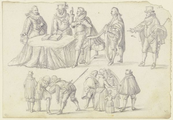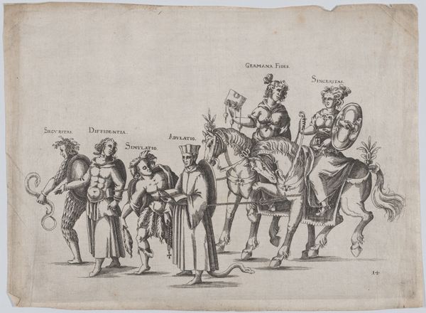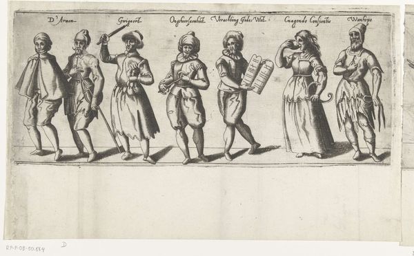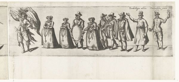 This is the third section of an anonymous engraving titled "Procession of the Rhetoric Chamber De Roo Roosen from Schiedam," created in 1607. The piece offers a glimpse into the cultural world of the Dutch Golden Age, a time marked by economic prosperity and artistic innovation. Here, members of a rhetoric society parade in costume. These societies were literary and dramatic associations popular in the Low Countries during the 15th and 17th centuries. Rhetoric chambers served as vital platforms for cultural expression. They staged performances and engaged in literary competitions. The figures, identified by labels, represent allegorical or biblical characters, each embodying a specific concept or virtue. We see figures like "Judas," "Greed," and "Wehsage" (sorrow). The engraving thus provides a snapshot of the values and moral concerns of the time. What does it mean to see the world through allegory? How do these figures reflect the aspirations and anxieties of Dutch society at the dawn of the 17th century? This print invites us to consider how art shapes cultural identity.