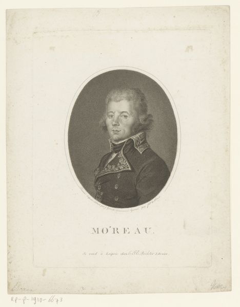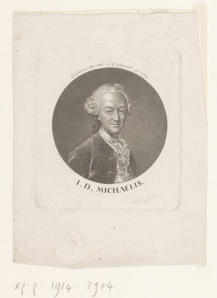 This is a portrait of Andrew Mitchell by Friedrich Wilhelm Nettling, made in an unknown year. The engraving presents a man encased within a tight oval frame, a formal device that immediately directs our gaze to the subject's face and upper body. The monochromatic palette, typical of engravings, gives the image a timeless quality, but also emphasizes the contrasting textures within the frame. Note how Nettling uses hatching and stippling to create depth and volume, particularly in the rendering of Mitchell's face and the intricate details of his uniform. The high contrast accentuates the whiteness of his powdered wig and lace collar, drawing a parallel with the stark white background. This visual language creates a binary between light and shadow, framing Mitchell as a figure of distinction. The careful attention to detail in the uniform, with its ornate buttons and embellishments, is not merely decorative. It speaks to Mitchell's status and authority within the social structure of his time. The formal constraints of the oval format work to contain, and perhaps elevate, the subject, reinforcing prevailing notions of order and hierarchy.