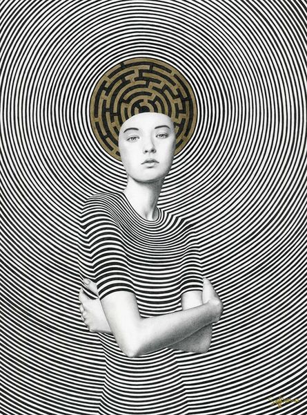 Sofia Bonati made this drawing, Mara, using ink, at some point in the 20th Century. It's all about lines, right? I mean, you’ve got the background swirling around like some kind of optical illusion. Then there's the maze on her head! It’s like her thoughts are a puzzle. The dress is pretty striking too, with these curved lines that seem to mimic the background, so you see how everything echoes everything else. The ink work is so precise, it gives the piece a real graphic punch, but there’s also a softness in the rendering of her face. Her face is so smooth, so serene. The way the grey mouse sits on her shoulder adds a strange and dreamlike element. All in all, Bonati’s art reminds me a bit of Escher, with that same love for geometric patterns and mind-bending perspectives, but she brings her own quirky, surreal twist.