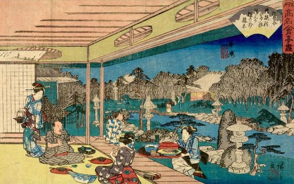 Editor: Here we have Utagawa Kunisada's "Act Three from the series Record of the Loyal Retainers," a horizontal oban print. There's such a strong sense of receding space and diagonal lines in the composition. What strikes you first about its formal qualities? Curator: The receding space is indeed significant, achieved through linear perspective and the repetition of architectural elements. Note how the artist manipulates colour to create depth, with cooler tones in the distance and warmer hues in the foreground, enhancing the spatial recession. The diagonals introduce a dynamic tension, drawing the eye across the scene. Editor: Fascinating. I hadn't considered the colour choices so deliberately. I see it now! Curator: Consider also how the arrangement of figures contributes to the overall rhythm. The careful distribution of their forms creates a visual harmony, reinforcing the print's aesthetic unity. Editor: Thank you. I'm beginning to understand how the formal elements create such a complex, yet harmonious, image.