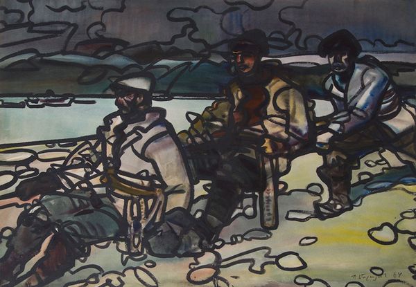 Curator: Looking at this charcoal and pen drawing by Adolf Hirémy-Hirschl, we see a study titled “Sailors in the Harbour of Pola.” Editor: My first impression is one of somber duty. The muted tones, the almost photographic realism in the rendering of the sailors… there's a palpable sense of weight to the scene. It feels very grounded, almost immobile. Curator: I agree. It captures a moment of naval life, but within a broader socio-political context. Pola, now Pula in Croatia, was a major port for the Austro-Hungarian Empire. Images like this were often deployed to reinforce the strength and reach of the Empire’s naval power. Editor: Indeed. Formally, observe how the artist uses layering to create depth. Notice the foreground figures; how meticulously Hirémy-Hirschl defines their forms. In contrast, the background sailors are almost ghostlike—merely hinted at. This focuses our attention on the labour, the ‘work’ being done in the moment, rather than the collective might. Curator: It's interesting how you interpret that choice. To me, the contrast may not be solely for emphasis. The less defined figures in the background might represent the rank and file—the nameless, faceless contributors to the imperial project, while those in the foreground represent the perceived glory or accomplishment. Editor: Perhaps both readings are valid. Consider the visual effect, however. The sharp contrasts serve to emphasize the texture of the materials—the fabric of the uniforms, the cool metal of the machinery they operate—again drawing the viewer into a very immediate, sensory experience of the moment. Curator: Absolutely. These were powerful visual strategies used to legitimize not only naval operations, but empire. Editor: It shows, too, the artist’s capacity to translate the complex into simplified lines. The use of shading helps render forms from simple markings; truly effective mark-making in service of complex composition. Curator: Considering the role that art played in shaping public opinion about war and naval power during that time gives me new appreciation for the multiple layers captured in the image. Editor: Yes. What initially felt like a static scene opens into a contemplation of materiality and its relation to power structures, which for me provides a valuable view.