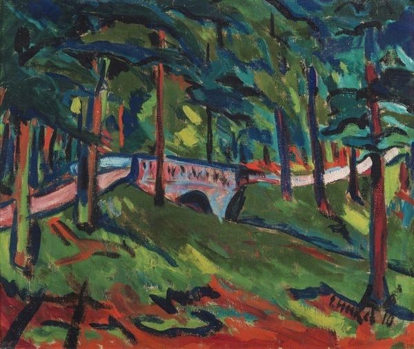 Editor: Here we have Henri Le Fauconnier's 1943 oil painting, "Village forestier Grosrouvre." It's an intriguing landscape, shrouded and obscured, almost melancholic. What symbols or deeper meanings do you think we can draw out from this piece? Curator: The overarching symbol is enclosure, isn’t it? The forest is a potent archetype representing both shelter and the unknown. Le Fauconnier positions the viewer *outside*, looking *in*. What does the forest withhold, what does it protect? Consider, too, that this was painted during the Second World War. Editor: That definitely casts a new light on it! So, you're suggesting the village represents something shielded from the conflict, or perhaps a collective memory that needs guarding? Curator: Precisely! And note the strategic use of color. The muted tones, almost concealing the village, reinforce this sense of secrecy, as does the composition. The vertical lines of the trees act like bars, and what could be a comforting image transforms into something more…ambiguous. Does that resonate with you? Editor: It does. I hadn’t considered the darker implications, focusing more on the style itself, which I interpreted as a loose Impressionism, perhaps even Fauvism. The expressive brushstrokes almost seemed joyful at first glance. Curator: And that’s a valid interpretation. Joy and melancholy are not mutually exclusive. The red of the foliage stands out starkly and could be related to themes of both life and danger during those years. Visual symbols layer upon each other across time. What stands out to you now, seeing it through this new lens? Editor: I now see a complex interplay between the visible and the hidden. What appeared simple is actually steeped in the anxieties of its time. Curator: Indeed, a painting that invites us to reflect on cultural memory, and how trauma can be both veiled and revealed through art.