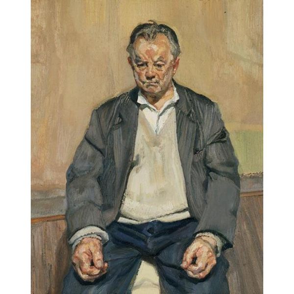 Editor: "Paddington Interior, Harry Diamond," an oil painting from 1970. There’s something both intimate and unsettling about it… the vulnerability feels palpable. How do you interpret this work? Curator: This portrait transcends mere representation; it's a socio-political commentary rendered in oil. The School of London, to which Diamond belonged, often depicted raw human experiences. I look at this image and consider how Diamond, working in a time of great social upheaval, is depicting the banality and precariousness of life through this domestic interior. Think about what “interior” signifies - beyond a room, an internal emotional state. Editor: So you see this ordinary setting as commentary? The subject's expression certainly seems loaded. Curator: Precisely. Is this man complacent or trapped? The inclusion of everyday objects, such as the bathtub in the background, challenges notions of privacy and highlights the encroachment of the public into personal space. Who gets access to such "intimate" scenes, and what biases do they hold? How is masculinity expressed, subverted, or reinforced in this scene? Editor: That's a perspective I hadn't considered, how our perception of “private” spaces can reflect societal shifts in really provocative ways. It encourages a different reading of the image! Curator: Exactly. What seemed like a simple domestic scene is actually quite complex. Thinking intersectionally, it calls attention to gender, class, and power within such constructed spaces. Editor: Thank you! I think I have a richer understanding of how socio-historical elements can influence art. Curator: The point is for us to see that this interior holds a much larger discourse on what makes us vulnerable and, paradoxically, resilient as people.