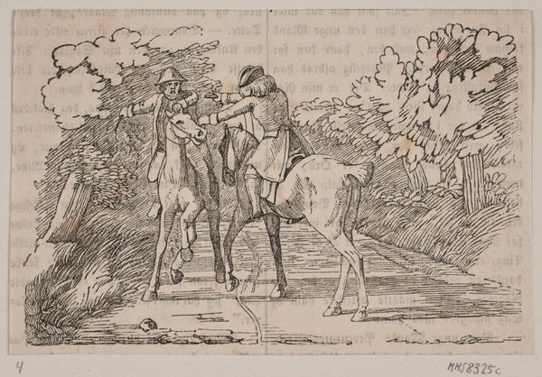 This small etching, "Illustration til et digt af P. Hansen", presents a tableau of rural life rendered in intricate detail by an anonymous artist. The composition is structured around a central motif: a horse, bearing a small dog on its back. The network of fine lines creates a sense of depth and texture, defining the forms of the figures and the surrounding landscape. To the left, the architecture of a well contrasts with the natural forms of the trees. To the right, a young boy with a fishing rod leads us into a rustic scene with chickens and a thatched cottage. The artist uses the materiality of etching to explore themes of labor and leisure, and to capture the essence of agrarian life. Through its formal qualities, the etching evokes a sense of both harmony and the quiet tension between nature and civilization. This image serves not only as an illustration but also as a reflection of the cultural values of its time, inviting endless reinterpretations.