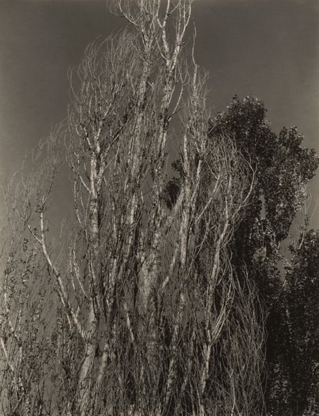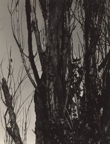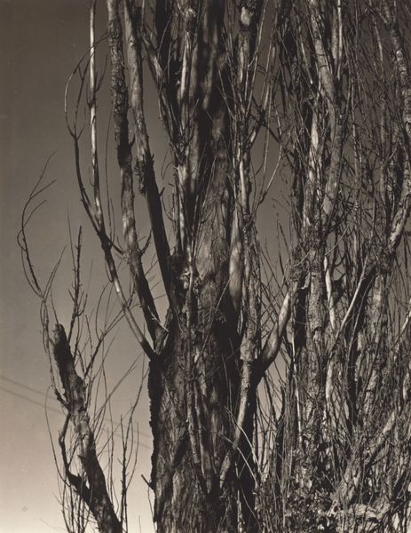 Nathan Lerner made this gelatin silver print, "Night Branches," at an unknown date. It features a composition of thin, white branches against a dark, blurry background. The photograph's high contrast evokes a sense of mystery and isolation, yet the natural subject matter also points to a potential commentary on urban life. In the context of the mid-20th century, when Lerner was active, such nature photography could be seen as a subtle critique of the increasingly industrial and artificial environments of modern cities like Chicago where he lived. The decision to focus on the overlooked, nocturnal aspect of nature might reflect a broader cultural interest in finding beauty in the everyday and unseen, challenging the dominant aesthetic values promoted by art institutions. Understanding Lerner's work requires us to consider the social and cultural values attached to nature and urban life during his time. By examining period publications, exhibition records, and critical writings, we can better appreciate how this photograph participates in broader discussions about the relationship between humanity and the natural world.
