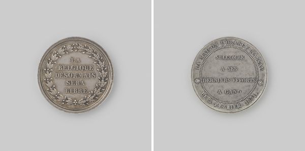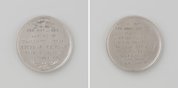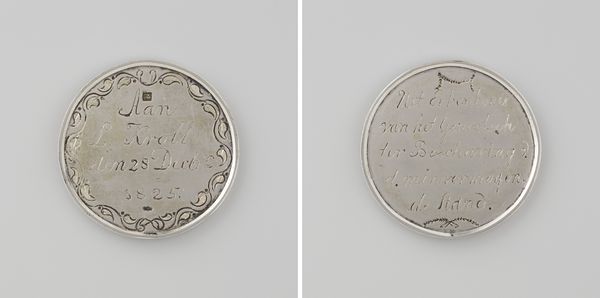 Curator: Looking at this metal sculpture by Nicolaas van Swinderen from 1751, "The Death of Samuel de la Douespe, Court Chaplain of William IV," I immediately think of currency, but then notice the inscription marking a life's end. Editor: Yes, it's like a somber coin, isn’t it? Polished metal glinting, but speaking of loss rather than wealth. The skull at the bottom… quite the memento mori. I wonder who Samuel de la Douespe was? Curator: He was William IV's court chaplain. The piece marks his death. On one side, you see dates—birth and death—framed within drapery and topped with an hourglass. It's a tangible representation of fleeting time. Editor: Absolutely! Time is so integral to commemorative iconography! I'm particularly drawn to the hourglass, and how its flanked with those wings. Not just time, but swift time, rushing away…it reinforces mortality's sudden arrival. It gives such a strange tone. I can almost imagine the chaplain himself commissioning this. "Remember me, but don't dwell, time flies!". Curator: Or perhaps it's meant to give comfort, a message to those left behind: life might be fleeting, but there's still value in the moment, even at the end. On the flip side, it simply states his role and tenure: "Pastor Leov, seventeen years," plain, like a final resume. Editor: "A final resume"—I like that! Simple, authoritative. Maybe less about comforting those who mourn and more about marking that man's footprint on his world. The bird figure near the inscription almost feels like an aspiration that exceeds all else. A hope, a soul released… Curator: It also might show how someone wished to be perceived—not as fragile, but eternal in faith. The artist truly manages to encapsulate a life, and distill all the most significant moments of his professional career, in such a small token. It's more than just remembering a death; it's acknowledging a life lived. Editor: Precisely! Each emblem—the hourglass, skull, winged time—functions as more than just decorum. Together, they offer not simply a summary of one single existence, but a lens for grasping broader existential realities about life, death, aspiration, remembrance and even accomplishment.
