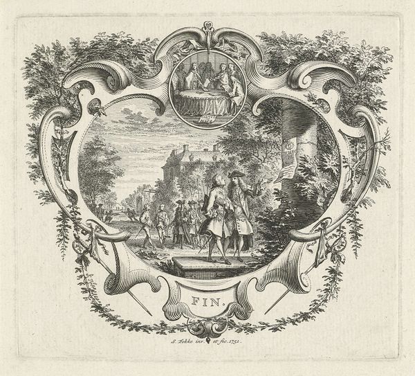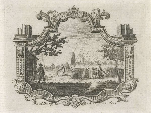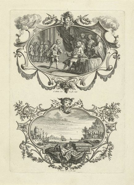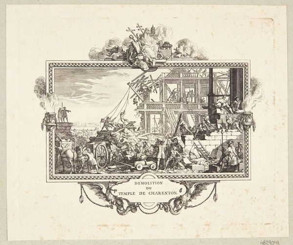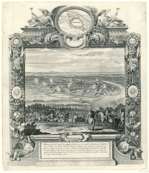 Editor: Here we have "The Siege of Namur," made between 1703 and 1717 by Johanna Sibylla Küsel. It's a print using etching and pen drawing, and depicts a pretty intense cityscape under attack. It feels very...dynamic, with all the smoke and activity, but also meticulously detailed. What catches your eye in this piece? Curator: It's funny, isn't it, how war scenes become these elaborately choreographed ballets on paper? Look at the layers of activity - from the foot soldiers in the foreground to the distant city consumed in smoke and explosions. This piece feels less about glorifying conflict and more about cataloging a moment in time, a spectacle meticulously observed. The composition, framed with ornate detailing, it is like looking through a keyhole into a grand performance of power. Editor: So, you see the framing as almost distancing the viewer, rather than pulling us into the action? Curator: Exactly! It’s like peering into a dollhouse, complete with tiny figures playing out very serious dramas. I wonder, do you feel any sense of awe, or perhaps horror when viewing this piece? Or does that frame keep you at a remove, simply observing? Editor: I think the distance does temper the horror, definitely. The detail is so intricate, I find myself more focused on the *how* of its creation than the *what* it's depicting. Curator: And isn't that the curious magic of art? Taking something horrific and turning it into an object of contemplation, inviting us to unravel its secrets one meticulous line at a time. It’s almost as though the artist transformed raw experience into something else. Editor: I like that: “transformed”. That makes me rethink my first impressions completely! Thanks for sharing. Curator: My pleasure! I find the chance to connect through art like this deeply refreshing and meaningful.