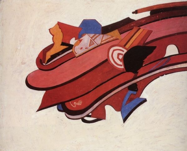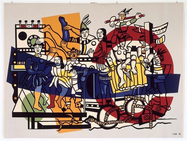 Editor: This is R.B. Kitaj’s "The Autumn of Central Paris", a painting rendered in mixed media. It has such a vibrant, yet almost melancholic mood about it. What symbolic language do you see at play here? Curator: Well, the cafe scene is ripe with symbolism, particularly related to transition and intellectual life. The umbrella-like awning dominating the top, for example, it’s ochre, reminiscent of decaying leaves... Do you sense any specific cultural or literary figures evoked in this work? Editor: I do get a bit of a pensive mood... maybe literary figures are part of it? It has this feeling like a scene from a play or film still. The individuals seem captured in their private reveries and I suppose that might mean more when one is aware of all of these various literary traditions. What stands out most for you? Curator: The fragmentation does, really. Look at the disconnected planes of color, the almost collage-like approach to figuration... these elements create a sense of psychological unease and, dare I say, a tension representative of fractured identity in a modern cityscape. Do the chair legs going right through some bodies spark your interest? Editor: That's unsettling now that you point it out. It disrupts a comfortable perspective, doesn't it? Curator: Exactly! Kitaj frequently used personal iconography combined with references to historical events and literary figures, suggesting an encoding within the seemingly casual gathering. Editor: It makes me want to spend more time to unpack his image system! Curator: Indeed, peeling back the layers would reveal Kitaj’s visual encoding and the richness of intellectual history behind the canvas.