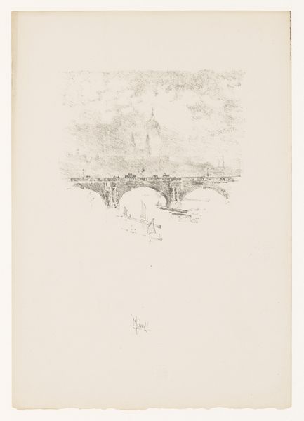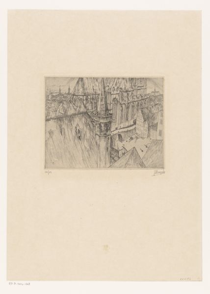 Editor: So, here we have "Bathing and Praying Men and Women on the Banks of the Ganges in Benares" by Wijnand Otto Jan Nieuwenkamp, from 1917. It looks like it's a pencil and etching on paper. The scene is really dreamlike, almost faded in a way. What stands out to you? Curator: Immediately, I'm drawn to the umbrellas – the repetition creates a symbolic canopy. In many cultures, the umbrella represents protection, royalty, spiritual power. Placed above figures in prayer and bathing, it suggests not just shelter from the sun, but divine grace, wouldn't you agree? Editor: I see that, yes! I didn't think about the spiritual implications of the umbrellas. So, are you saying it's not just about the artist recording what he sees? Curator: Nieuwenkamp likely selected this framing for more than simple documentary reasons. Benares, or Varanasi, is a sacred city; the Ganges is believed to purify. Consider the act of bathing itself - a cleansing, a renewal. Look at how the figures are positioned, turned towards the river... Are they surrendering or receiving something? Editor: It’s like they are between worlds. There's something very transient about the image as well, almost like a memory fading. Curator: The ethereal quality supports this sense of transition and purification. Nieuwenkamp, steeped in orientalism, possibly romanticized this moment. Can we interpret it as respect or exoticisation? And whose point of view is emphasized? The worshipper's or the observer's? Editor: I hadn't thought about the tension of perspective. That shifts my understanding entirely! I see it now as more complex, a layered narrative. Curator: Precisely. It reveals cultural memory and continuity using this single visual scene. There is symbolism beyond what first meets the eye. Editor: It’s fascinating how a seemingly simple drawing can hold so much weight and nuance.