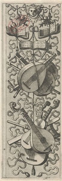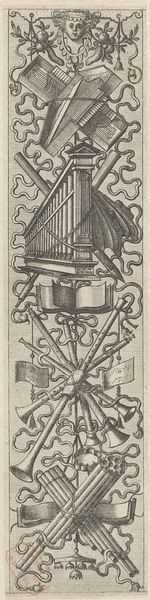 Editor: This is the "Trophy of Musical Instruments," created around 1572 by Johannes or Lucas van Doetechum. It's an engraving. It feels celebratory, but also very ordered. It's fascinating to see so many instruments arranged in such a structured way. What do you see in this piece? Curator: Oh, I love this! It's a wonderfully elaborate… controlled chaos, perhaps? Think of it as a snapshot of Renaissance musical life—instruments piled together like a joyous, noisy orchestra waiting to happen. The book of music at the very top hints at the theoretical underpinnings, but the instruments themselves are what sing. Don't you think there's something very celebratory about it? Editor: Absolutely! There’s almost a sense of abundance, but did people in the Renaissance really have that many instruments? Curator: Perhaps not everyone owned that many, but music was highly valued. Courts would employ musicians, wealthy families might collect instruments. It signifies wealth, sophistication, patronage, and a real immersion in artistic practice. I wonder what kind of music these instruments would play together? Editor: Now I'm imagining the sounds, that’s very different from only seeing the image! All the possibilities for creating a symphony. It almost encourages one to go learn an instrument, doesn't it? Curator: Exactly! And who knows what you could find by learning an instrument! It is so exciting.