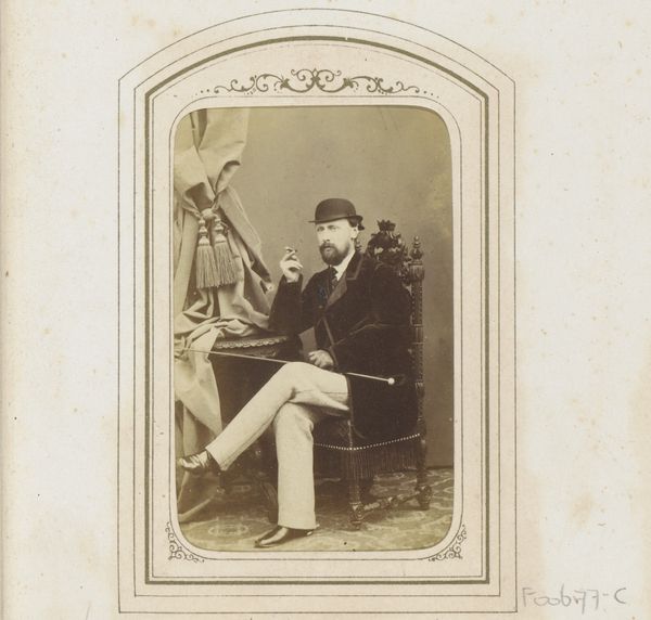This photographic portrait of a moustached man with a top hat was made by Clarkington & Company. The photograph, though modest in size, reflects significant industrial processes. It's a chemical print, likely an albumen silver print, where paper is coated with albumen from egg whites, then sensitized with silver nitrate. This technique, common in the 19th century, allowed for sharp and detailed images. The making of this photograph demanded considerable labor, from preparing the chemicals to posing the subject and printing the final image. It speaks to the rise of commercial photography, as skilled artisans adapted scientific knowledge to serve a growing middle class eager to capture and share their likeness. By focusing on photography's materiality and production, we move beyond the image itself, to consider the broader social and economic context in which it was created.