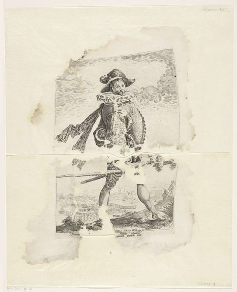 Editor: We are looking at Vaandeldrager, from the late 16th century, a pen, pencil and ink drawing found here at the Rijksmuseum; it seems so academic but I think also narrative in composition! I feel immediately as though I should understand some crucial story or message being presented to me - and what is with the ripped paper, the imperfections...?! How do you interpret this work? Curator: Oh, I see this less as a complete message and more like... a fleeting thought caught on paper, the creative process itself almost a subject! There is this raw kind of northern renaissance energy. Note how the "flaws," these distressed elements of torn paper or fading ink, are also what draw you in, right? Editor: Yes! That experimentation. That definitely comes through - what draws you in the most though, when viewing such an older piece? Curator: It’s like discovering an artist's notes or doodles from another time. Makes them real somehow. In some of those ink tests they did there, are figures playing? And even those dark shadows, almost smudges - how are *they* part of the overall image? Makes one wonder... are they random, mistakes? Or did the artist mean them...to echo feelings, ideas they were grappling with? Editor: Ah, yes, that does place us in dialogue with the process more, doesn't it. It transforms that almost ruined feeling into intimate insights. I wouldn't have come to this perception on my own. Thank you! Curator: Art changes once we invite fresh thoughts. It almost becomes something new again each time.