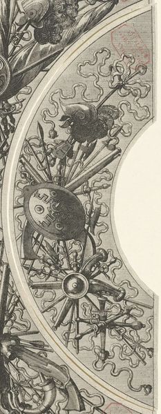 Editor: So, this is the "Grote gebogen wapentrofee," or Large Curved Trophy of Arms, an engraving made in 1572 by Johannes or Lucas van Doetechum. It's packed with different weapons and armour... it almost feels like organized chaos. What strikes you when you look at this? Curator: The density, definitely, and how these objects become symbols themselves. Each weapon, shield, or piece of armor carries a story of power, status, and perhaps even vulnerability. Notice how they're arranged in a semi-circular form, almost like a fragment of a Roman triumphal arch? Editor: Yes, I see what you mean! It is very deliberate and grandiose. What would something like this signify to viewers in the 16th century? Curator: Think of cultural memory. Weaponry isn’t just about war; it represents virtues. What virtues do you think this image aims to invoke? Bravery? Strength? Authority? Consider, too, that this was made during a tumultuous period, perhaps it functioned as a potent reminder of power and the order the artist sought. The arrangement becomes a kind of visual rhetoric. Editor: I hadn't thought about it in terms of virtues...it almost feels like they're trying to ward off chaos by displaying them. I guess seeing these objects not just as tools, but symbols loaded with cultural meaning is a helpful shift. Curator: Precisely! By understanding those symbols, we gain insight into the cultural landscape of the time. It’s all about looking beneath the surface, past the literal image. What about the serpent-like decorations around the curve? Editor: Yes, now I wonder if that's a specific reference I'm missing! All these intertwining symbols open a new lens for viewing the artwork. Thanks!