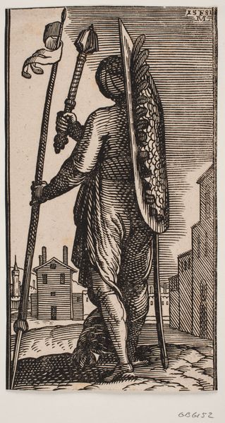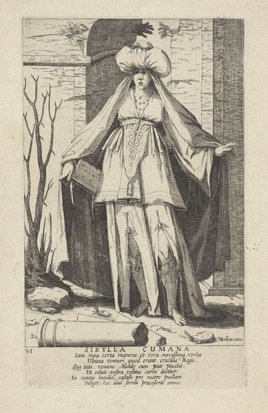 Editor: So, this is "Veiled Woman Walking, Profile to the Left; In Front of Her, A City Wall with Towers Rises from the Water," a woodcut in ink by Melchior Lorck, dating back to 1582. I’m struck by the woman's anonymity – she's completely veiled. It makes her feel strangely distant and yet central to the entire scene. What do you make of it? Curator: I'm drawn to how Lorck situates the female figure within a fraught geopolitical context, inviting us to consider issues of gender, power, and representation. Think about the 16th century – a period of intense exploration, colonization, and religious conflict. Does the woman's veiled presence symbolize cultural encounters, perhaps even the veiled realities of women within these power structures? What’s hidden from our view? Editor: That's interesting. I hadn't considered it from that angle. The city in the background… is that significant? Curator: Absolutely. The city looms, partially submerged, almost threatening. Consider it as a metaphor for established orders challenged by forces of change – whether that be the reformation, burgeoning capitalism, or perhaps the rise of powerful new empires. And where does that leave this lone female figure, poised between anonymity and visibility, the personal and the political? Does she have agency? Editor: So, her veiled state isn't just about modesty, but perhaps about power dynamics? A way of both concealing and perhaps, subverting, the established order? Curator: Precisely! The veil, a potent symbol of both oppression and resistance, becomes a focal point through which we can examine identity and social structures in this moment in history. Editor: This gives me a lot to think about. I initially saw a simple, almost melancholic figure, but now it's clear she embodies complex societal tensions. Curator: It reveals the importance of examining artwork beyond aesthetics, using history and theory to unearth the profound narratives they hold.
