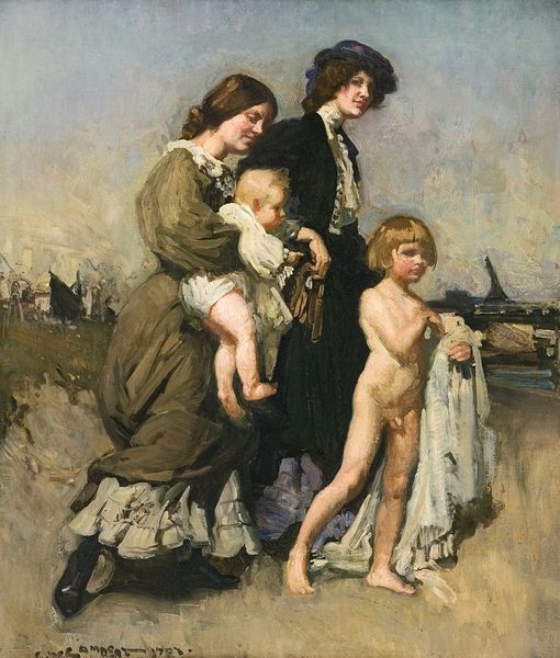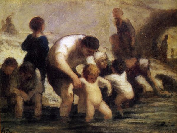 Curator: Looking at George Washington Lambert’s "The Pond," painted in 1908 with oil paint, I am struck by its subdued but sensual mood. It’s almost as if he caught a private moment between the bathers, while it makes one recall times gone by. What’s your take? Editor: The first thing I notice is the texture – that broken, crackled surface in the lower right, it gives the painting such an age, like time has literally eaten into it. You almost feel as though it is being excavated. That impasto he uses in other areas really catches the light. Curator: Absolutely, there is that raw, almost primitive handling of paint which contrasts so markedly with the subject itself. This juxtaposition brings attention to the socio-historical dimensions of artistic labor: look at the fashionable clothing versus these nude and barely clothed figures enjoying a simple pond bath. Editor: It’s a beautiful study in contrasts—the light catching the children, versus that impenetrable dark mass that shrouds part of the background figures. It reminds me a little of sun dappled moments when you glimpse people through thick foliage... moments of hazy recollection. Do you see that link to his portraiture work too? Curator: Without a doubt, Lambert brings his keen observations of the figure into this so-called landscape. It’s about observing material culture—clothing, gesture—set against a seemingly idyllic rural space. How might industrial advancements and a certain urbanisation allow this leisure? Editor: It's almost as if he's saying, look, even in our most natural moments, we are shaped by the artifice around us. Those social restraints we imagine we are freed of do still mark us in a very intimate way. The gaze, their postures...it is all staged. Curator: And staged for whom? The artist's gaze, of course, the very labor that manifests this image. Think too, what sort of gendered roles and expectations come into play, which have changed, though we are still working to overcome this. Editor: Absolutely! And that staged aspect makes this work far more interesting than some other impressionistic pond or lake scenes. Thank you for shining new light on Lambert’s work today; I can already anticipate thinking of his use of materiality with a fresh perspective.